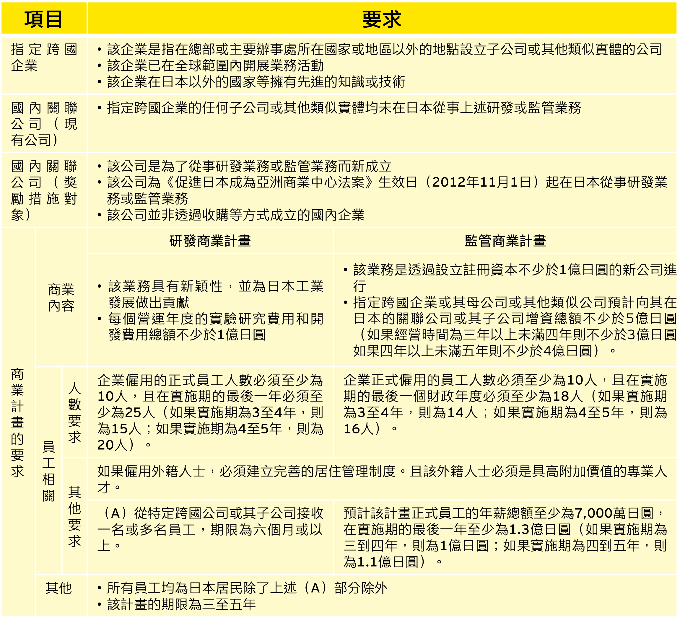 企業經營者若為了獲得《促進日本成為亞洲商業中心法案》所提供的獎勵措施,必須符合以下表格所示的(1)指定跨國企業(2)國內關聯公司及(3)商業計畫的要求,且相關經營者必須由政府主管機關之主管部長認證其商業計畫。