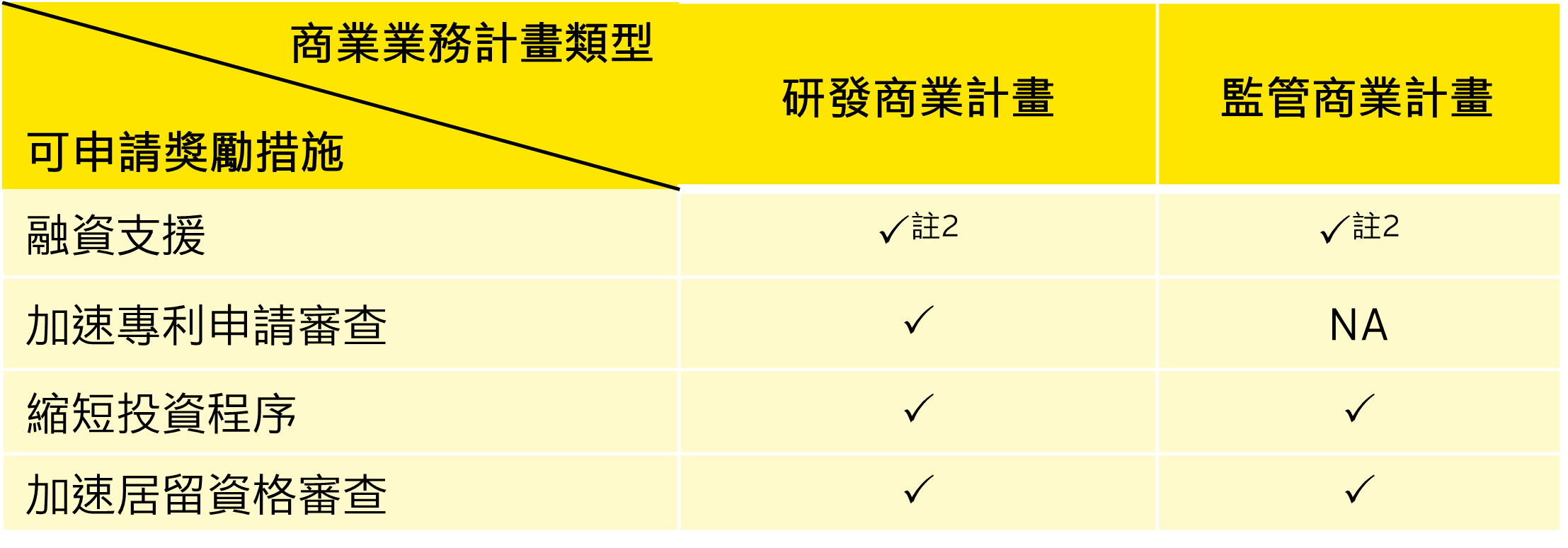 有意開展研發或監管業務的特定跨國企業如已獲得商業業務計畫認證,可以申請相關獎勵措施如下表,惟下列各項措施仍需經過相關審查機構的審查和確認才可以適用。