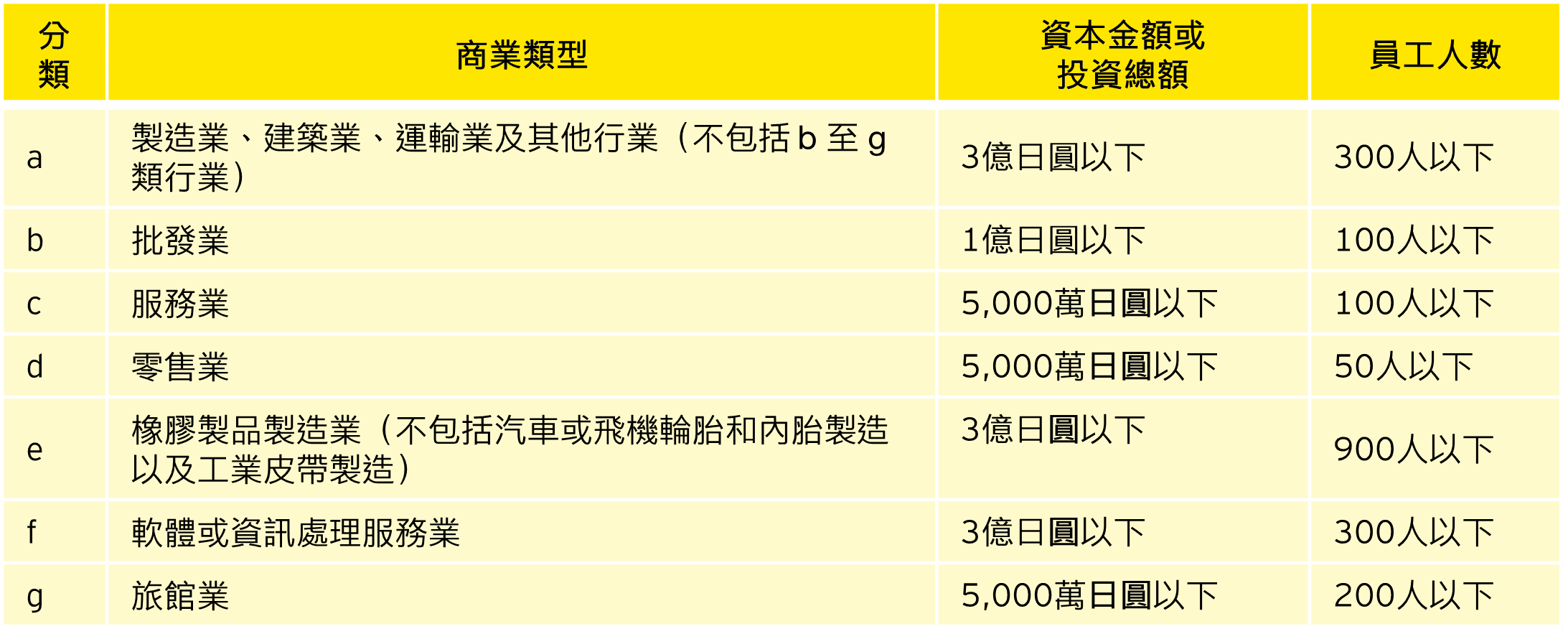 註3:根據促進日本成為亞洲商業中心法案,中小企業經營者的定義如下:(符合資本額標準或員工人數標準任標準的企業均視為中小企業經營者)