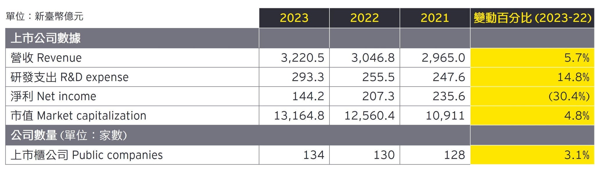 安永聯合會計師事務所審計服務部執業會計師王彥鈞分享<超越邊界2024生物科技產業報告>,從生技產業全球發展趨勢來看,2023年美國和歐洲生技產業上市公司營收為1,919億美元,較2022年下降10.7%(圖1),主要是COVID-19疫苗和治療藥物的收入下降。2023年美國與歐洲的生技產業面臨四大挑戰,營收下降、淨利跌幅43.4%、員工數下降1.7%、上市公司數量減少5.3%(圖2)。反觀臺灣2023年整體營收與市值相較2022年亮眼(圖3),也投入更多研發成本,顯示臺灣生技產業逐步邁入由營收創造市場價值的實質階段,朝穩健成長的方向邁進。