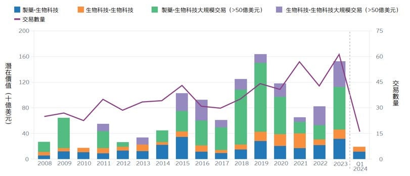 針對生技醫療併購交易與策略聯盟發展趨勢,安永財務管理諮詢服務(股)公司執行副總經理吳培源指出,生技產業在2024年和未來將繼續釋出大量併購火力(圖4),由於大型生技製藥公司正面臨「專利懸崖」,在未來五年之間可能損失3,500億美元收入,營收壓力將促使他們收購創新公司。2023年國際上共有61筆併購交易,總金額達1,540億美元(圖5)。大規模交易帶動併購市場成長,其中多數收購目標為已經上市或處於後期臨床研究階段產品的公司。腫瘤學為併購市場中最熱門的治療領域,具有臨床驗證和商業效果的抗體藥物複合體(ADC),成為2023年併購的優先標的。