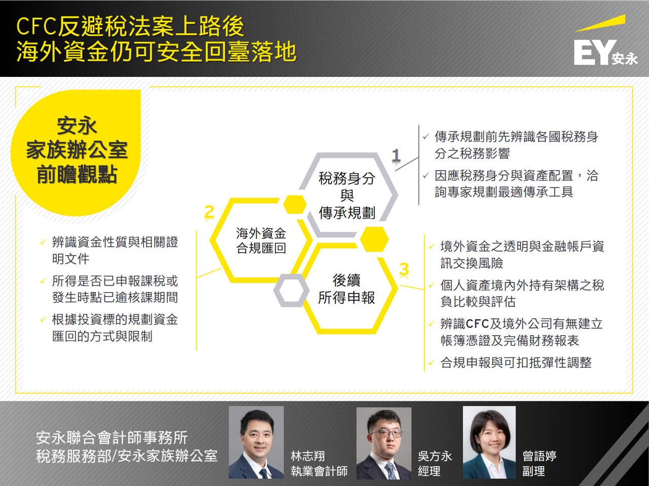 安永聯合會計師事務所林志翔執業會計師表示,儘速檢視個人境外資產的狀況,及早準備相關申報應備文件,以期在必要時刻適時捍衛自身重要權益。