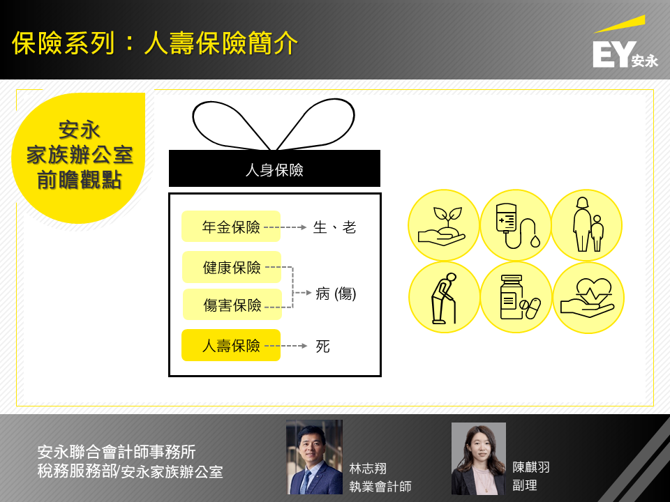 2025 12月 08 Strategy by EY-Parthenon保險種類豐富多樣,且具有支付方便、管理方便及應用彈性靈活等優勢。除了保有原先的風險轉移性質以外,更具備了生活保障、投資理財、資產傳承與保全、預留稅源等優點。針對不同的需求及資產配置的安排與規劃,是現代不可或缺的傳承與規劃工具之一 。